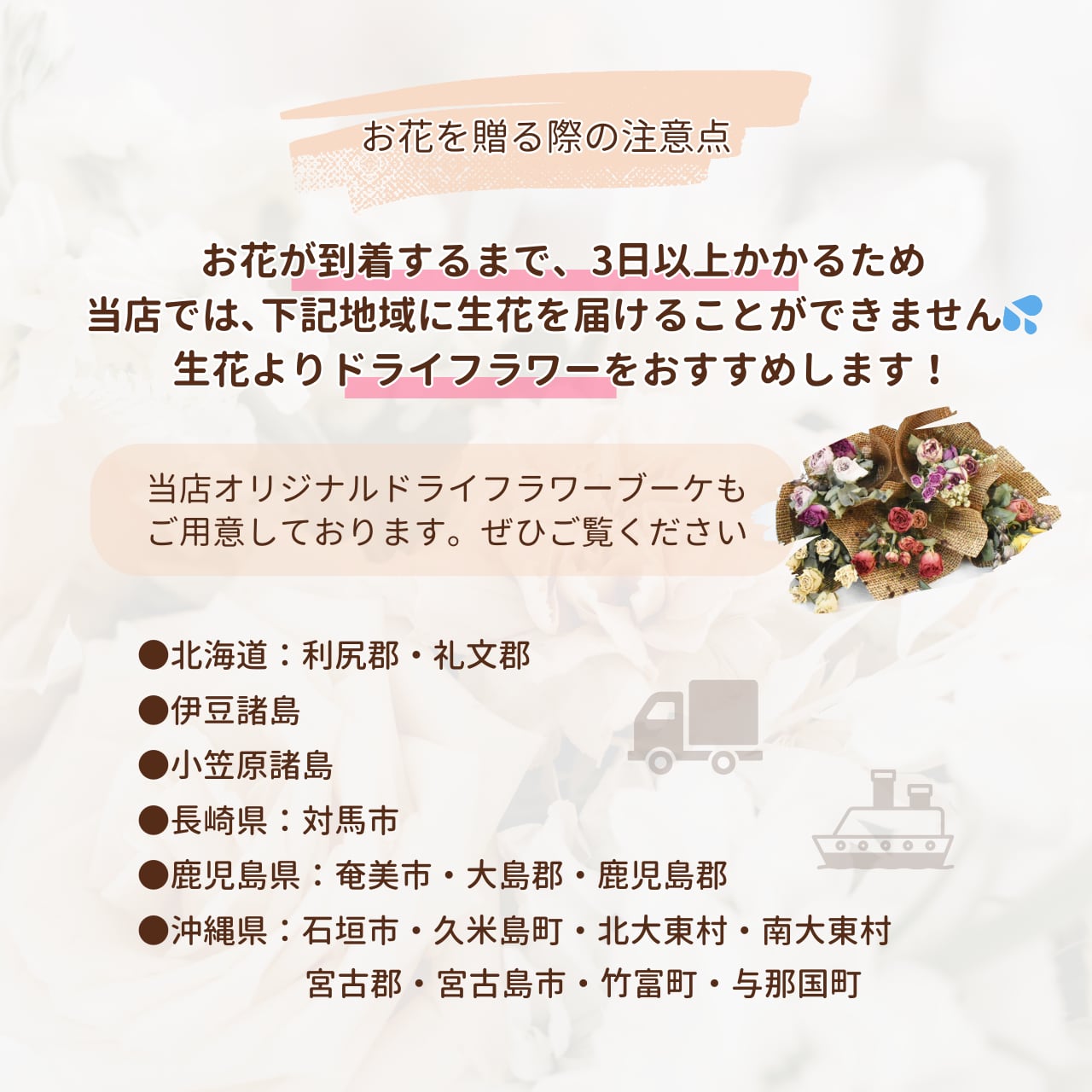 ※配送日数が3日以上かかる地域には、生花のお届けができません。 何卒ご理解ください。
